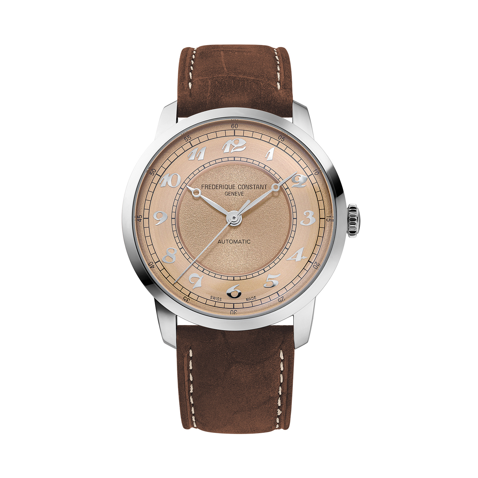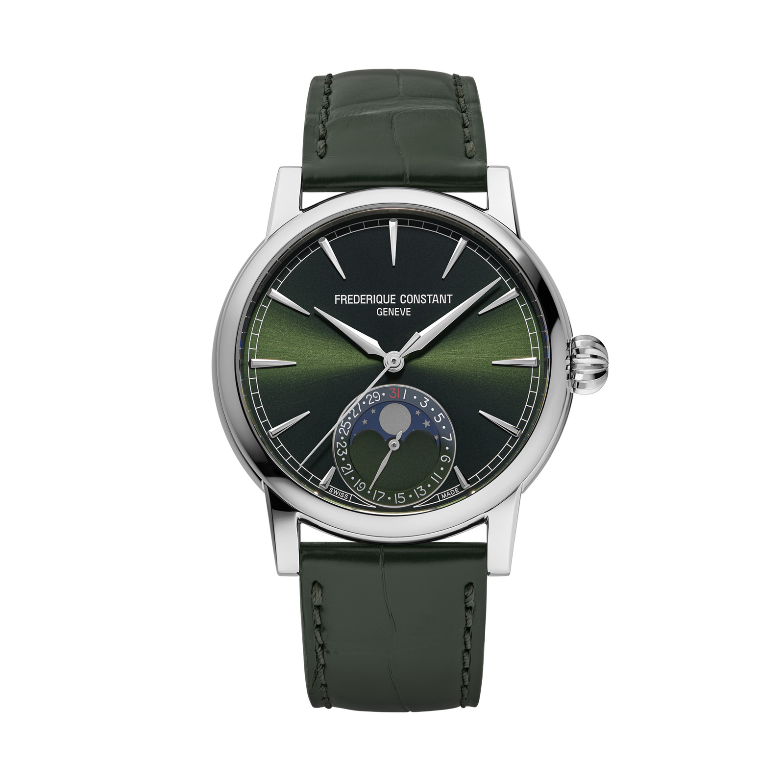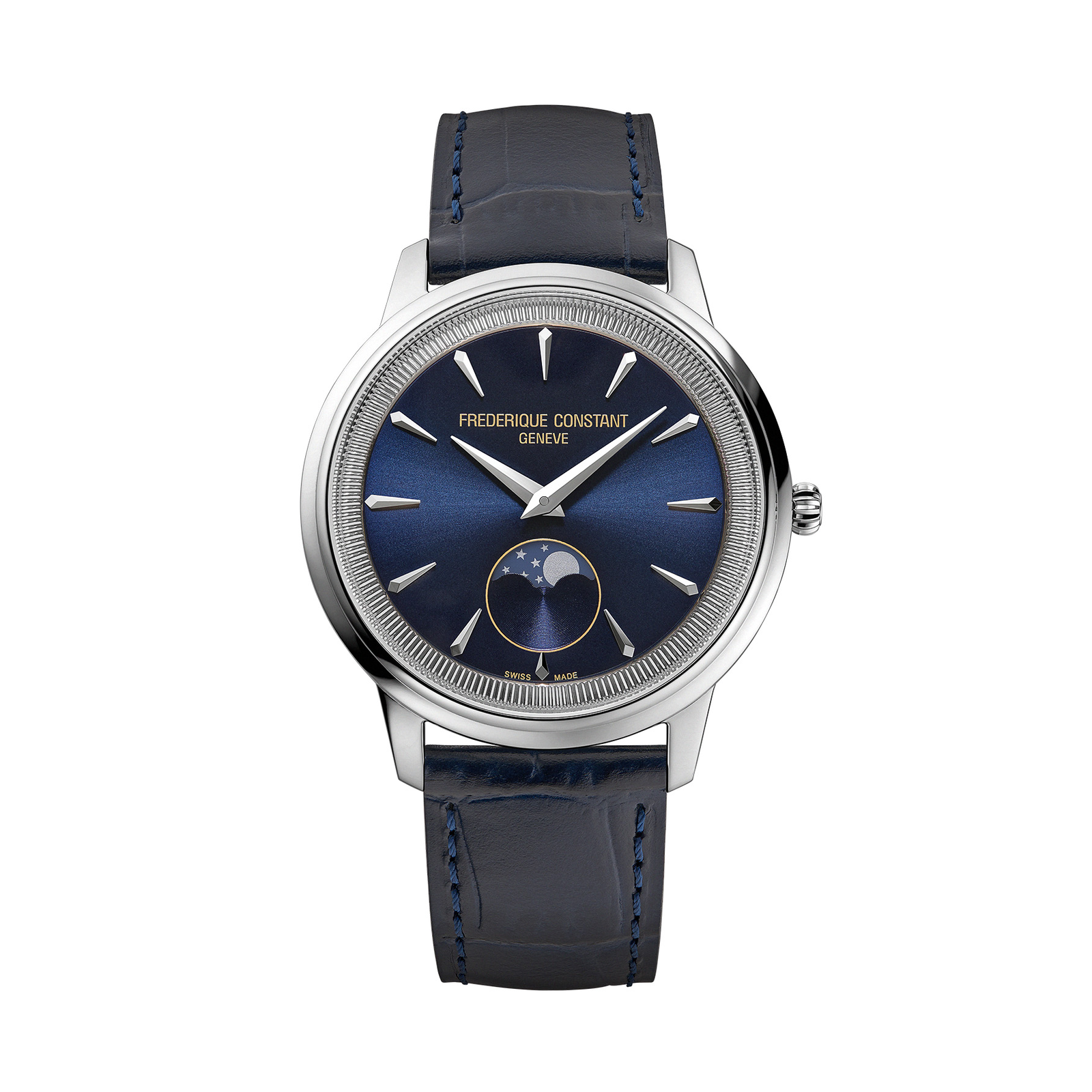 Schlicht, elegant und modern: Die Classic Moonphase Date Manufacture, das Vorzeigemodell von Frederique Constant, bleibt ihrer traditionellen DNA treu und wird heute in drei neuen 40-mm-Variationen mit dem neuen Classic-Gehäuse aus Stahl auf einem silbernen.